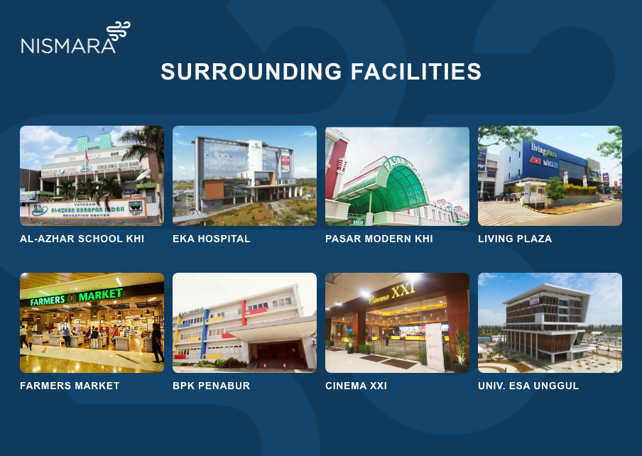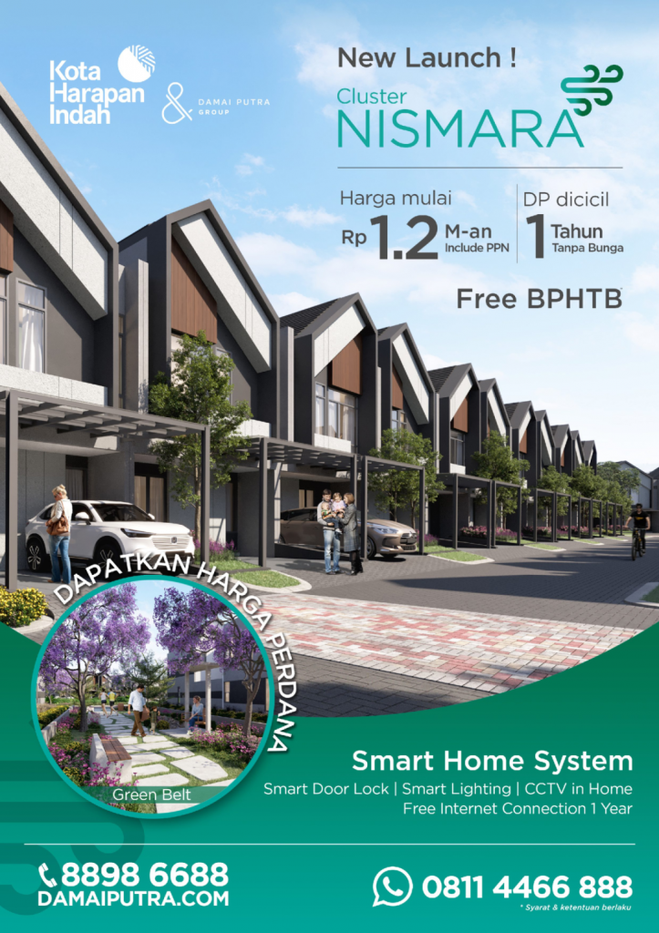 Cluster Nismara terletak di lokasi premium Kota Harapan Indah. Dikelilingi berbagai fasilitas perbelanjaan, pendidikan, pusat bisnis, serta aksesibilitas yang mudah dapat dijangkau dengan 3 Gate akses yang lebar, menjadikan Nismara sebagai rumah sempurna untuk Anda dan keluarga.
